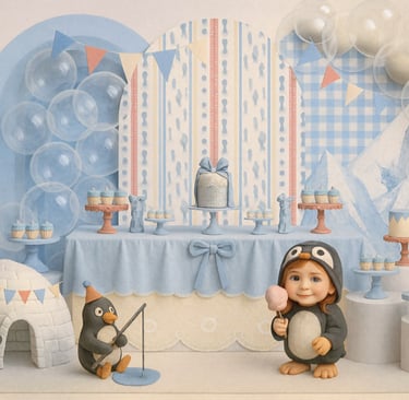 Mesa Principal (Mesa do Bolo): É o coração da festa. O projeto detalha cada elemento: o design do painel de fundo (tecido, madeira, balões), o tipo de mesa, os suportes para doces, o bolo (cenográfico ou não), arranjos florais e todos os itens decorativos que a compõem.